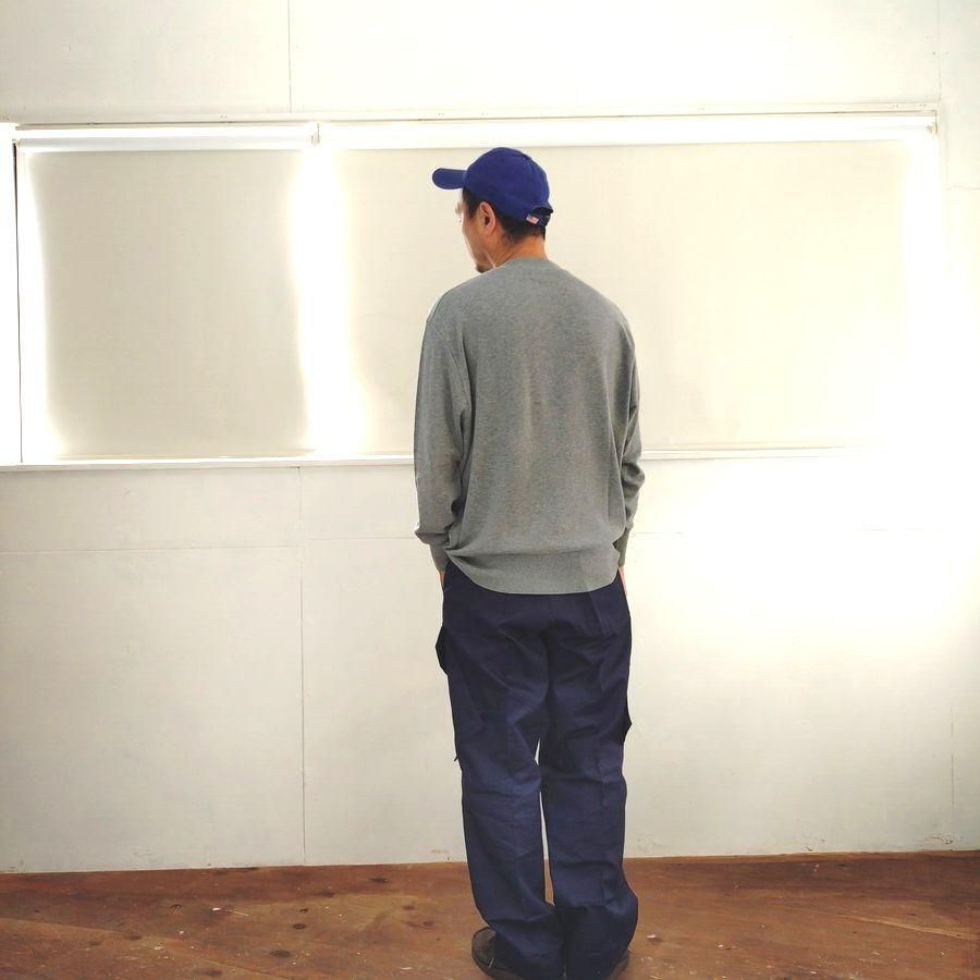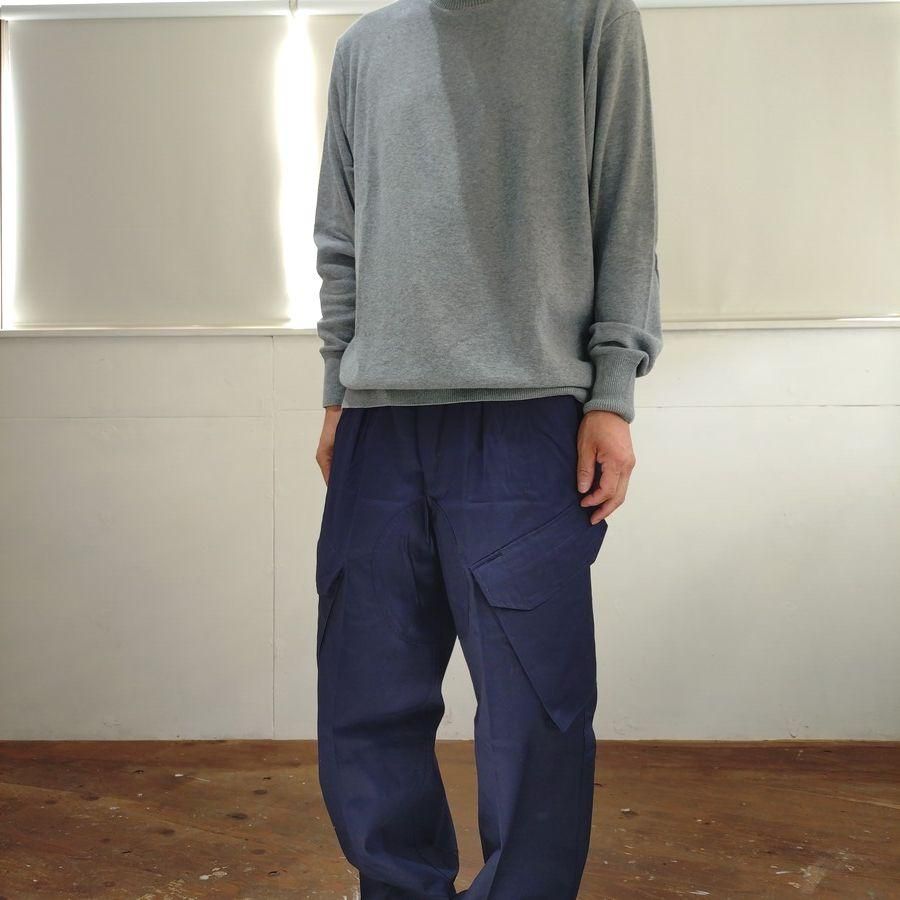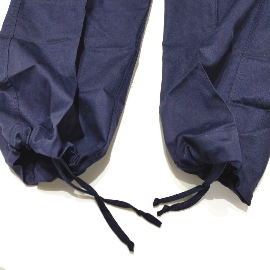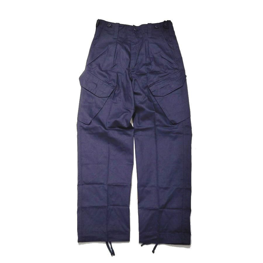 スラントポケット(斜めにサイドポケットのついたタイプになります)が斬新です。 独特なディテールや作りの良さを兼ね備えているパンツです。海軍の使用するマッドなネイビーブルーの色は別格に良いです。ミリタリーながらとても綺麗で上品な雰囲気を持ったカーゴです。 ステッチワークも独特で、フラップポケットはパラシュートボタン仕様で程よくテーパードしたシルエットでゆったりとしたサイズです。